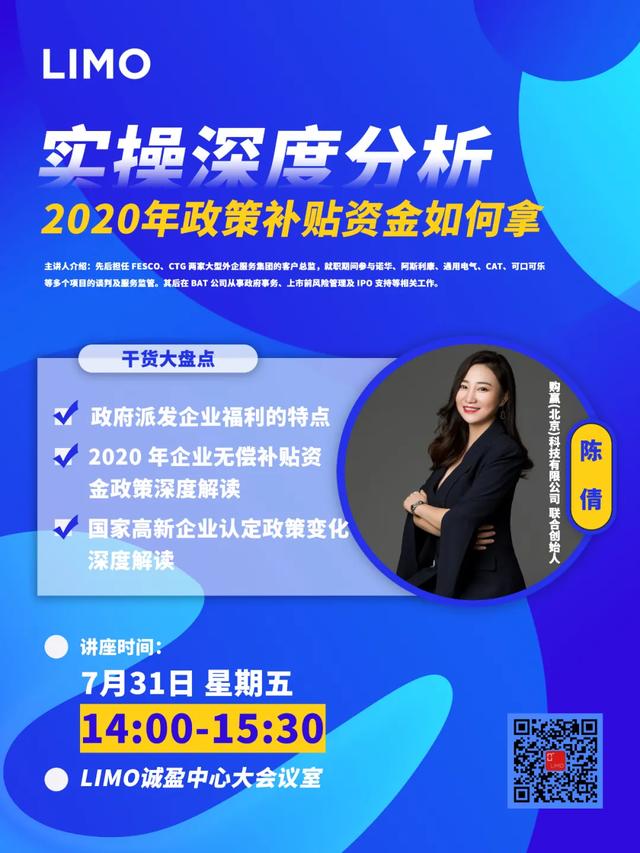 欢迎大家报名参加本次LIMO课堂,聆听2020年企业相关政策补贴深度解读,参与答疑互动!