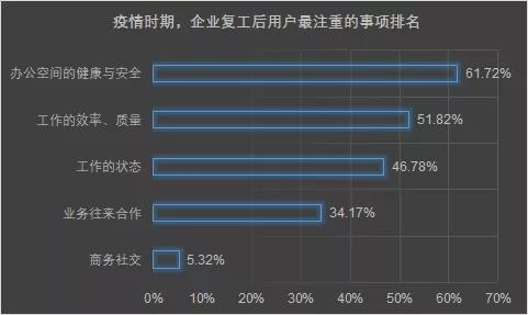 据零秒LIMO调研数据显示,疫情期间复工,企业主及员工认为办公空间的健康与安全是第一位的,在保障健康的情况下,工作的效率和质量也尤其重要。