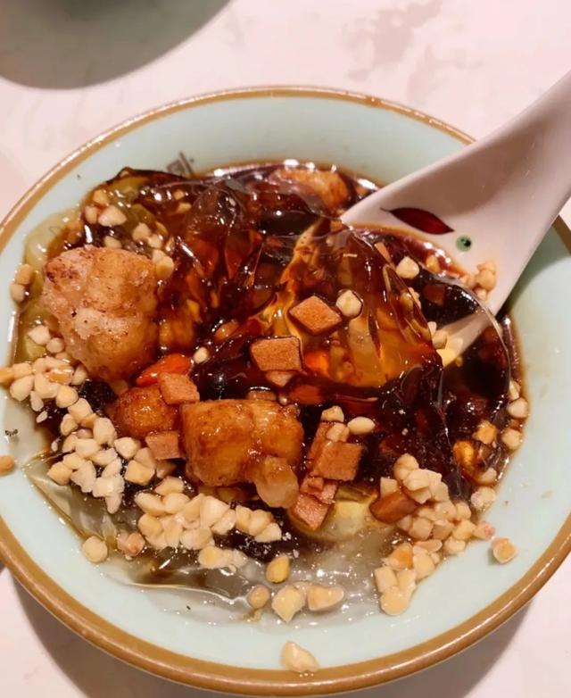 冰冰凉凉的一小碗,用料满满,山楂、花生碎、枸杞、葡萄干铺在晶莹剔透的冰粉儿上,点睛之笔红糖糍粑块儿的加入得到一致好评。这样一碗酸甜可口的小甜品,解辣又去腻,零小秒非常推荐!